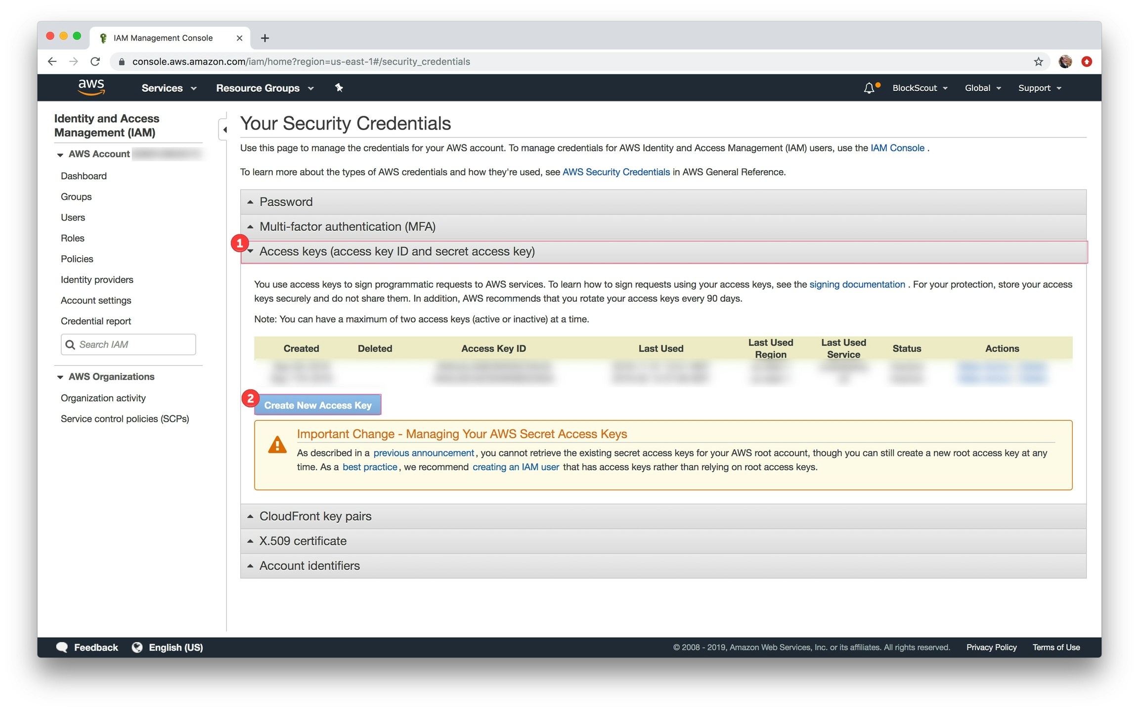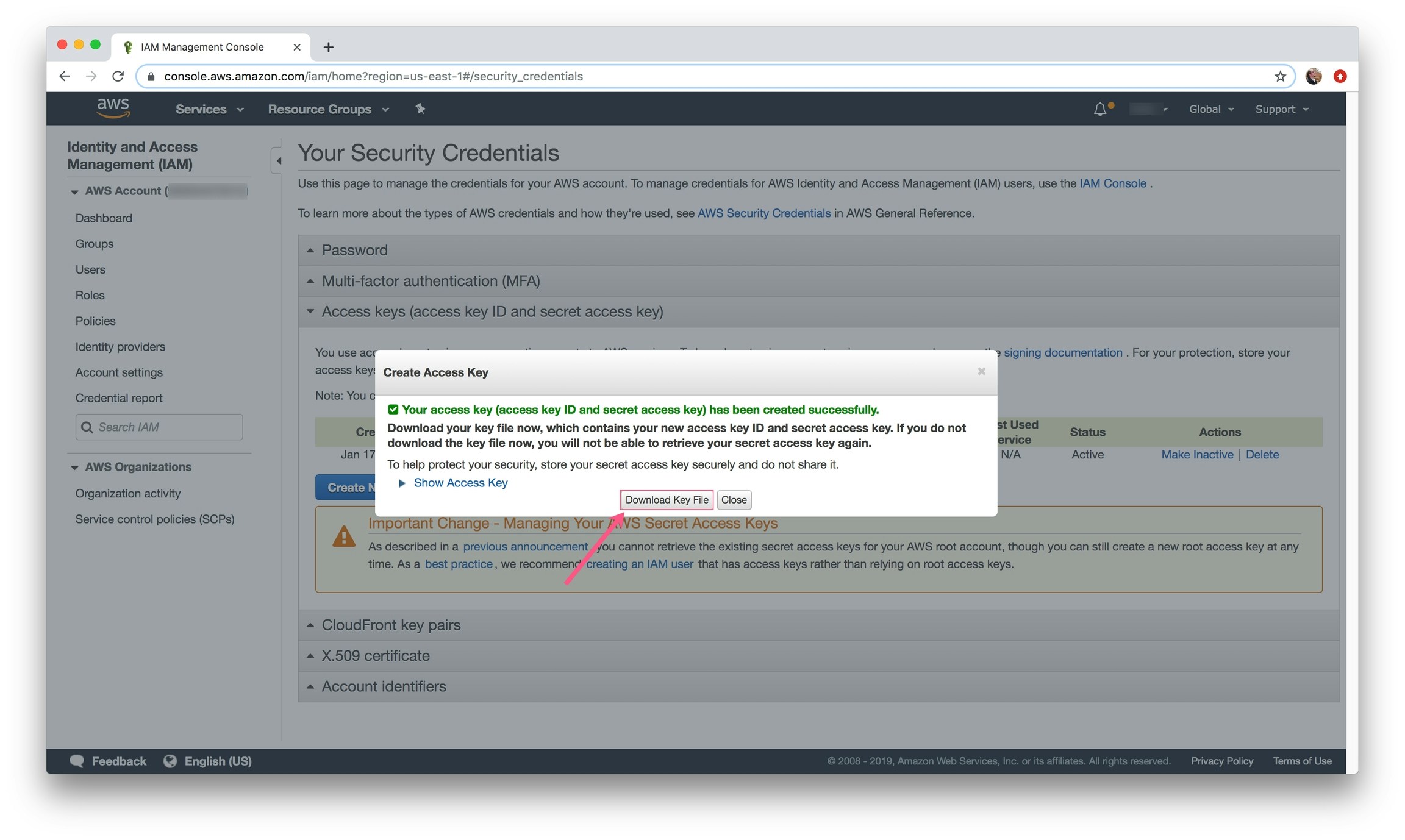 3) Download your key file and store it in a safe place. You will need it to login with the AWS CLI. The file will include: